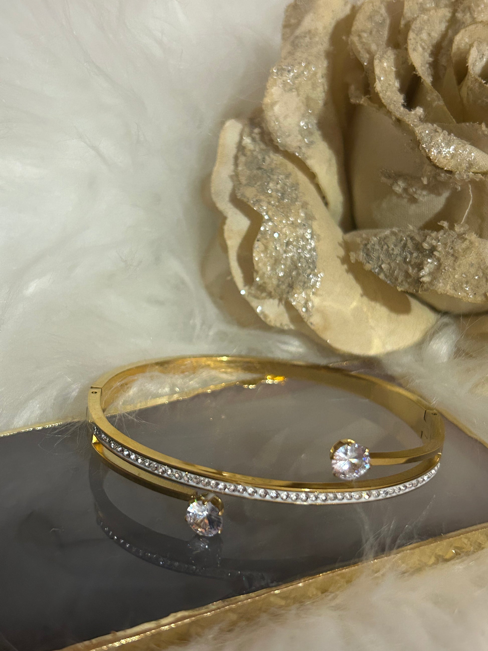 Deze gouden roestvrijstalen armband belichaamt moderne elegantie. De strakke lijn wordt verfraaid door een rij fonkelende kristallen en twee centrale briljant geslepen stenen, die bij elke beweging het licht vangen. Licht en verfijnd, hij is zowel dagelijks als voor speciale gelegenheden te dragen, en voegt een vleugje discrete luxe toe aan uw pols. Gemaakt van roestvrij staal, nikkelvrij, cadmiumvrij en loodzoutvrij.
