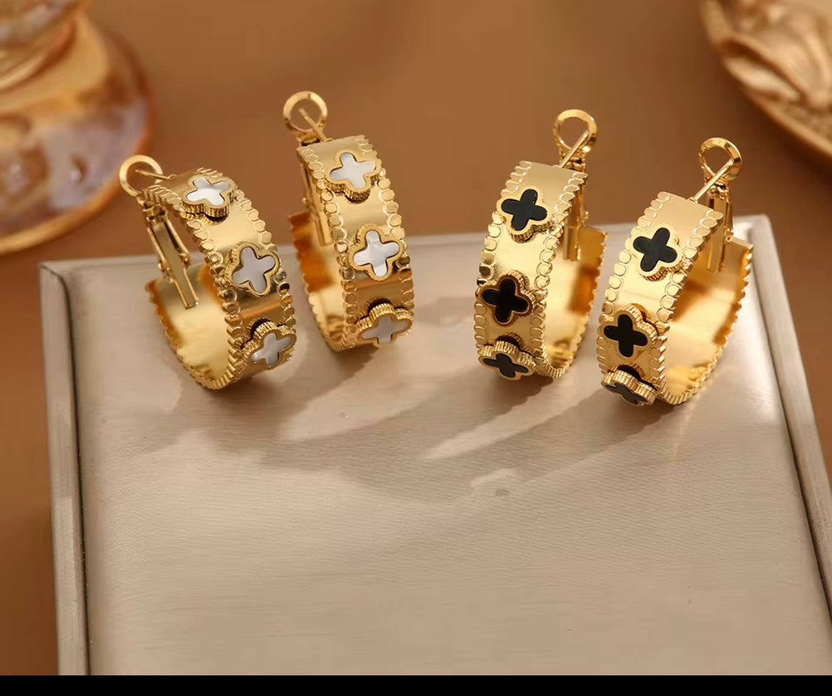 Deze elegante oorringen stralen pure luxe uit dankzij hun 18K vergulde afwerking en verfijnde klaverdesign. Het hoogwaardige roestvrij staal zorgt er voor dat ze duurzaam, kleurvast en huidvriendelijk zijn.