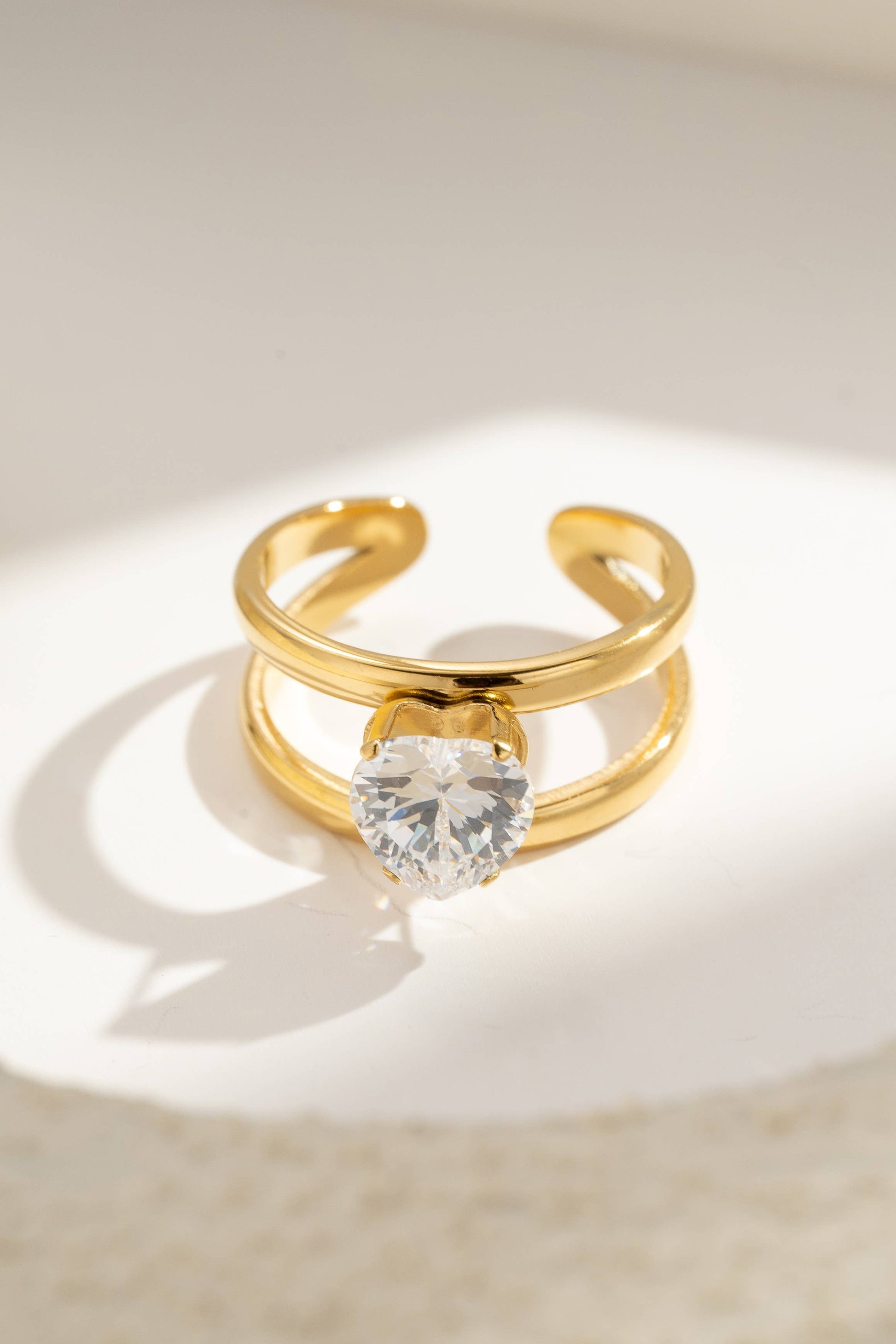 Val voor deze verstelbare ring van roestvrij staal met verfijnd dubbel ringontwerp. De hartvormige, nauwkeurig geslepen kristal weerkaatst het licht schitterend voor een romantische en eigentijdse touch. Ontworpen om comfortabel op elke maat te passen, combineert het robuustheid met elegantie. Perfect om liefde uit te drukken of een outfit te verfraaien, dit unieke stuk belichaamt de fusie tussen sculpturale moderniteit en tijdloze charme.