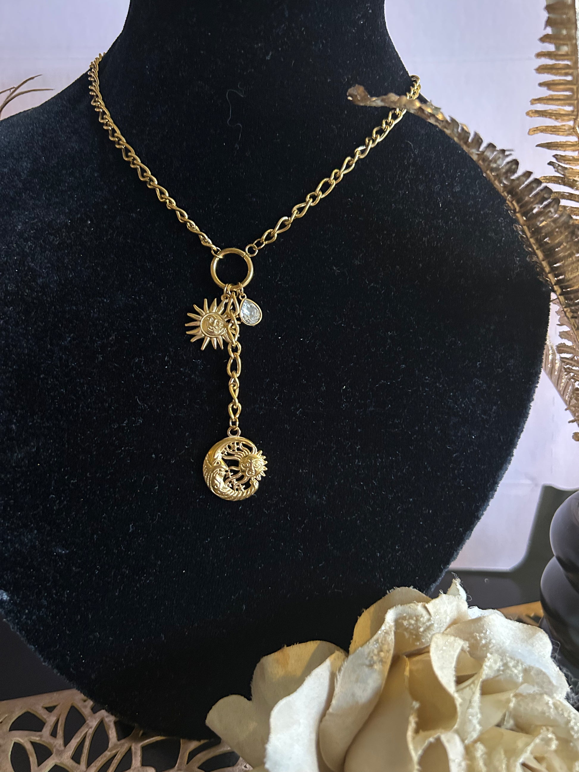 Een stralende gouden ketting bestaande uit een dikke schakel en drie bedels: een stralende zon, een kristallen druppelsteen en een gegraveerde medaillon met maan en zon. Een symbolische creatie tussen licht en mysterie, ideaal om je stijl te verlichten.
