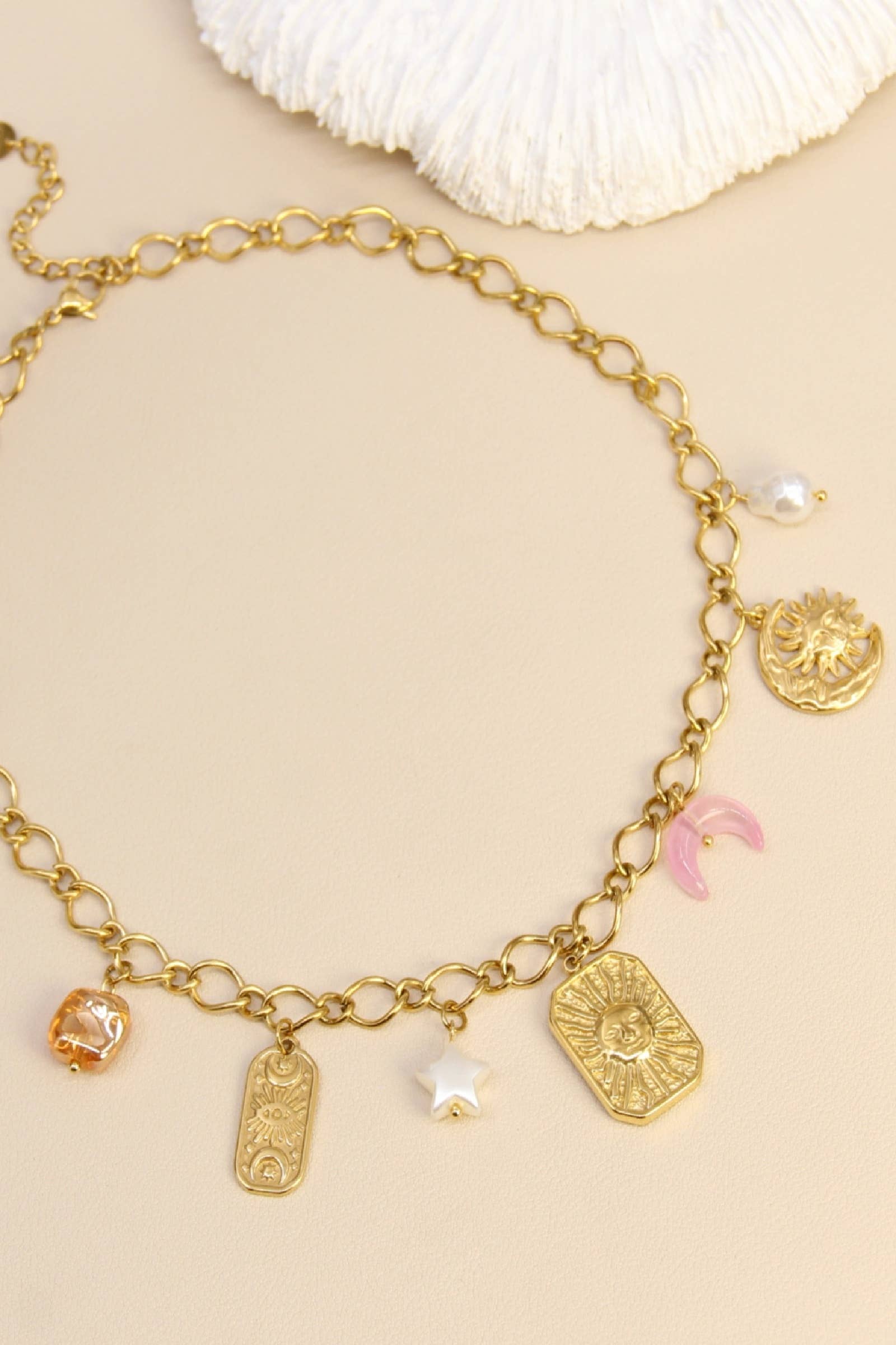 Duik in een mystieke sfeer met deze ketting versierd met hemelse bedels: zon, ster, roze maan, parel en gegraveerde medaillon. Een sterk en trendy stuk, perfect om je zomerse looks te verfraaien.